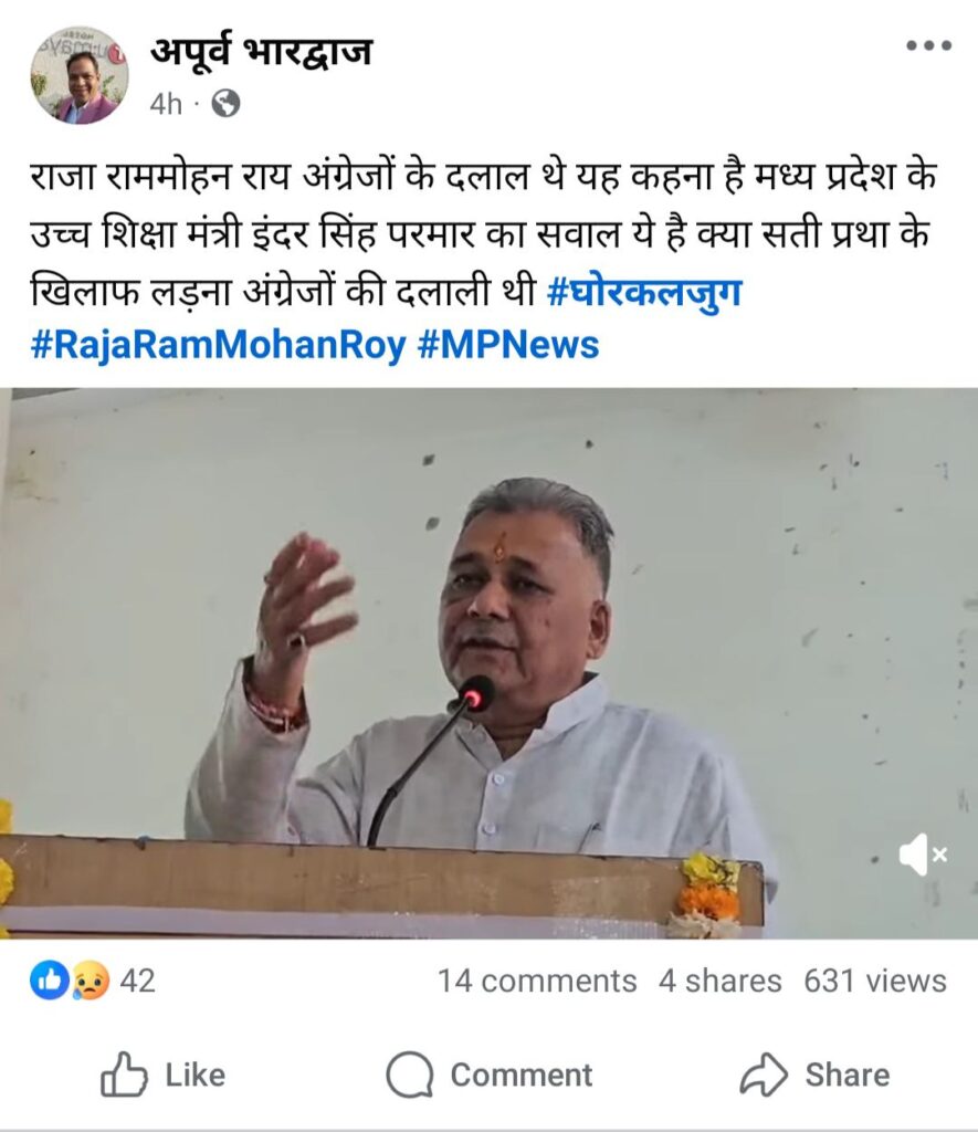 कांग्रेस नेता और डाटा एनालिटिक्स-इंफ्लुअर्स अपूर्व भारद्वाज ने इंदर सिंह परमार का इस तरह का बयान देता हुआ वीडियो अपने फेसबुक अकाउंट पर शेयर किया है। sandhyamidday.com इस वीडियो की कोई पुष्टि नहीं करता है। अपूर्व द्वारा पोस्ट इस वीडियो में परमार ने एक कार्यक्रम में मंच से भाषण देते हुए कहा कि अंग्रेजों ने उस समय बहुत सारे फर्जी समाज सुधारक खड़े कर रखे थे, उनमें ही एक राजा राममोहन राय भी थे। असली समाज सुधारक बिरसा मुंडा थे। यह बड़ी बात है कि देश में इस समय तीन महापुरुषों का 150 शताब्दी वर्ष मना रहे हैं। एक बिरसा मुंडा, दूसरा सरदार वल्लभ भाई पटेल और तीसरा वंदे मातरम।